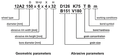 Diamond and CBN resin bonded grinding wheels are designated according to the following scheme: